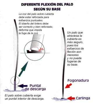 COZ O BASE DEL PALO Este es el nombre que recibe la base del palo. Tradicionalmente el palo atraviesa la cubierta por el agujero denominado fogonadura, y descansa sobre una pieza destinada a tal efecto llamada carlinga. La carlinga permite variar el punto de descanso de la base del palo, produciendo una caída más o menos pronunciada del palo hacia popa, hacia proa o que trabaje completamente vertical. Manteniendo fija la fogonadura y variando la coz, podemos cambiar la caída del palo siempre que también modifiquemos el estay y baquestay. En los aparejos que descansan sobre cubierta es necesaria la colocación de un puntal que descargue sobre la quilla o sobre la zona reforzada del fondo que lo recibe. La coz sobre cubierta obliga a dotar a la cubierta de un basamento que impida la fuga del palo en condiciones de navegación dura, y es recomendable reforzar la coz con un zuncho perimetral que no aplaste y abra el material del perfil, pues la flexión del tubo no reparte la fuerza por igual en toda la coz. FOGONADURA Es la abertura por donde el palo atraviesa la cubierta para descansar sobre la quilla. Esta zona sobre la quilla es en los veleros actuales la más reforzada del barco, pues recibe las más altas tensiones. Estas tensiones son la compresión del palo, el esfuerzo de los cadenotes (landas) donde arraigan los obenques y la sujeción del ala de la quilla. La tensión de la jarcia que sujeta al palo implica la compresión del tubo, por lo que tiende a fleax combando el perfil. Si el palo descansa sobre cubierta, esta curvatura parte desde la misma coz, pero si el palo descansa sobre la quilla el tubo queda sujeto por la fogonadura, disminuyendo el esfuerzo en el tramo inferior. Siempre será más inseguro un palo que descanse sobre cubierta, pues existe un peligro de desplazamiento de la coz. Como es lógico, un puntal interior deberá conducir el esfuerzo de compresión hasta la quilla. La fogonadura presenta siempre problemas de estanqueidad, y además deberá disponer de buenas cuñas para impedir movimientos, así como de refuerzos interiores que repartan las tensiones. Estos problemas se suprimen en los palos sobre cubierta, motivo por el cual acostumbran a arbolar este tipo de aparejo las embarcaciones de crucero y no las de regata. Manteniendo las longitudes del estay y baquestay, y sin variar la posición de Cruceta la coz en la carlinga, podemos acuñar el palo en la fogonadura por popa. En este caso el palo adquiere la llamada preflexión, aunque existen otros métodos para preflexionar el palo. Toda preflexión incrementa el riesgo de rotura. |
